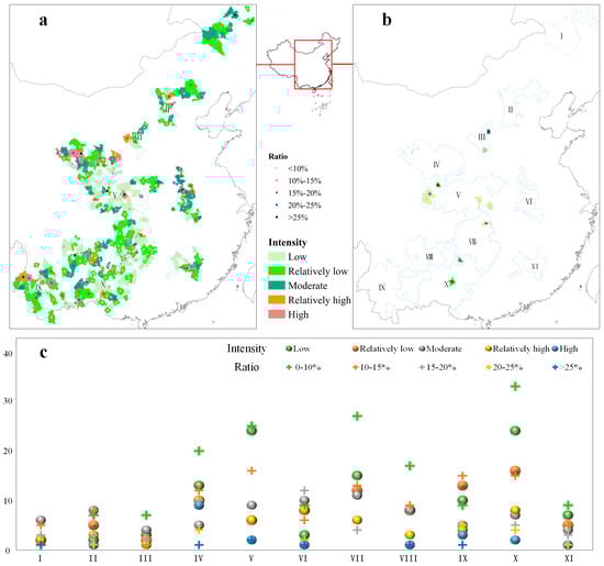 Based on the natural breakpoint method, counties were categorized into five levels of intensity of change: low, relatively low, moderate, relatively high, and high (Figure 6). From 2000 to 2020, CDA expansion intensity comprised 109 low counties, 87 relatively low counties, 77 moderate counties, 52 relatively high counties, and 20 high counties, representing 31.59%, 25.22%, 22.32%, 15.07%, and 5.8% of all, respectively. Most counties were at the levels of expansion intensity with low or relatively low, and the counties with moderate, relatively high, and high levels of expansion were mainly concentrated in IV (24), VI (19), X (17), V (17), and VII (17).