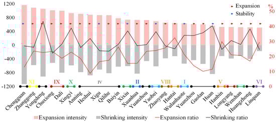Thirdly, in this study, we described the expansion intensity and ratio of expanding counties, and the shrinking intensity and ratio of shrinking counties. In fact, in the detection of regional change, the expansion and shrinking of the counties exist simultaneously. According to the ranking of expansion intensity, the four indicators of expansion intensity, shrinking intensity, expansion rate, and shrinking rate of the top 26 counties ranked at 5% are shown in Figure 8. There are 12 high-expansion counties in IV, mainly concentrated in Lanzhou City, including Chengguan District, Yongdeng County, Anning District, Xigu District, Qilihe District, Yuzhong County, and Gaolan County. Almost all of them were well-developed metropolitan areas or adjacent to big cities, with obvious regional advantages. At the same time, these counties also had a strongly shrinking intensity. It indicates that in the counties, the accumulative light intensity of pixels rather than a certain threshold value changes strongly, and the interior of these counties has strong vitality accompanied by expanding and shrinking in development. Therefore, most counties are expansionary with strong expanding and shrinking, and a few are stable, such as Chengguan District and Xigu District. The ratio of expansion and shrinkage is aimed at the number of pixels that reach a certain intensity of change in a region, which can be understood as the ratio of land expansion and shrinking from the perspective of geographical space. However, in all cases, the shrinking ratio is generally greater than the expansion ratio, indicating that the space where the light was weaker shrank substantially, while the space where the light was stronger expanded slightly. The space of CDAs was generally economical and characterized by intensive development. We should not only focus on the counties that show a contraction type. It is also necessary to pay attention to the counties with a large shrinkage ratio or contraction intensity, and there is also a potential trend of returning to poverty.