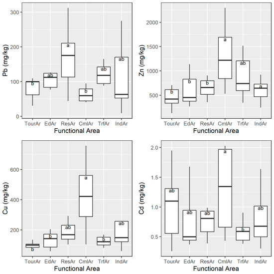 Concentrations of heavy metals in road dust of various functional areas in Guangzhou. Within each heavy metal, the boxes marked with the same letter at the same stage are not significantly different (p = 0.05).
