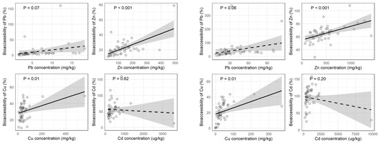 Correlation between the dissolved fractions and bioaccessibility of Zn, Cu, and Pb in both the gastric and intestinal phases. Solid lines indicate statistically significant relationships (p < 0.05), while dashed lines represent non-significant trends. The shaded area in gray represents the 95% confidence interval.