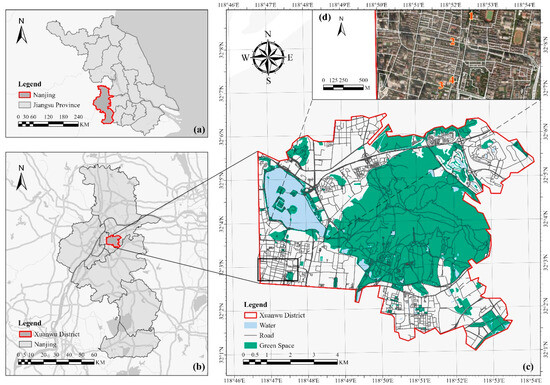 Location of the streets selected as case studies. (a) Jiangsu Province, (b) Nanjing City, (c) Xuanwu District, (d) Distribution of selected streets: (1) Taiping North Road, (2) Zhujiang Road, (3) Changjiang Road, (4) Beiting Lane.