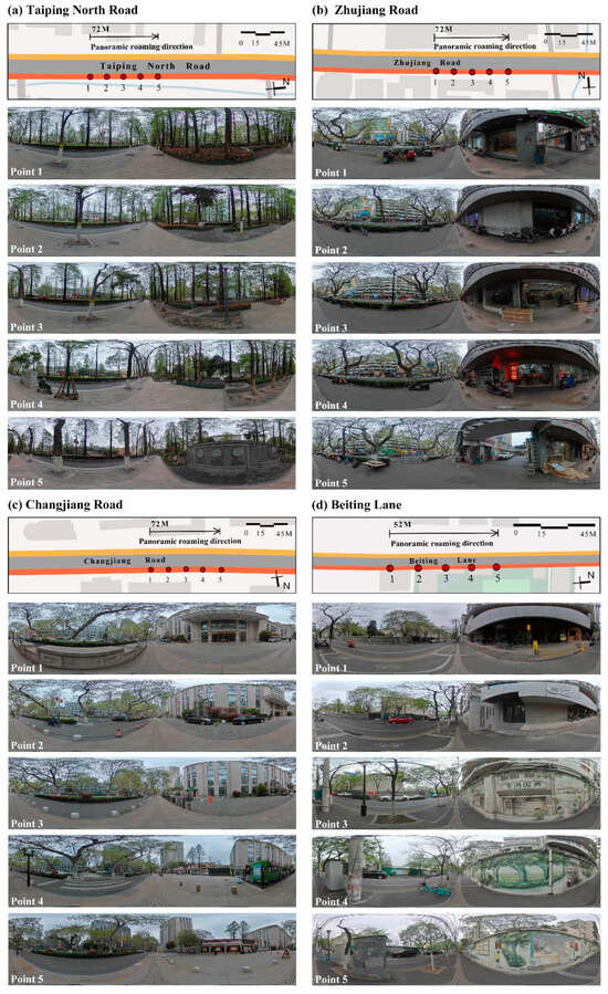 Panoramic street image data were collected on the selected sample streets using the RICHO THETA SC2 device (RICHO Company, Ltd., Tokyo, Japan). To maintain the continuity and authenticity of the walking experience, five sampling points were established along the selected streets, spaced at intervals ranging from 13 to 18 m, depending on the streets’ length (Figure 2). According to the China Health Association [51], the average height for adult females in China is 1.58 m and for adult males, 1.697 m. Therefore, a height of 1.5 m, simulating eye-level height, was maintained by utilizing a tripod during the image capture process. To mitigate the potential impact of weather conditions on the experimental outcomes, the image capture was conducted at 11:00 a.m. on cloudy days. To effectively illustrate the time variation on the streets, we captured photographs two months apart during spring, specifically on 5 March 2024, and 2 May 2024, from identical locations along each street.