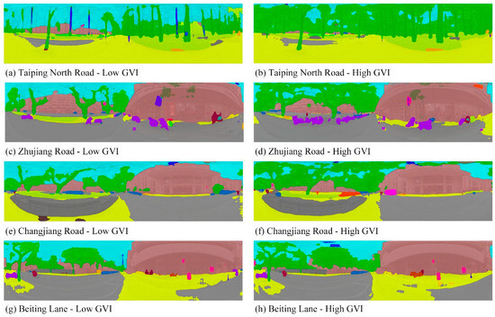 Following this, PSPNet was employed to assess variations in the GVI of the streetscape. By leveraging the ADE20K dataset, we classified pixel points within the panoramic images, identifying various landscape components such as the sky, buildings, sidewalks, trees, and grass, assigning category a distinct color (Figure 3). This allows for the calculation of proportional changes in different elements within images captured at the same street location on two separate occasions, thereby serving as a reference for alterations in the GVI (Table 2).