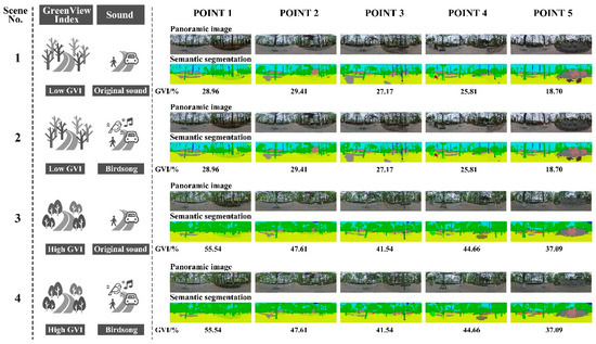 The 720yun platform (https://www.720yun.com/, accessed on 5 May 2024) was used to develop VR panoramic roaming scenes, with links to various scenes available in Table S1 in Supplementary Materials. Users can interact with the environment at each location by dragging the screen onto the webpage and can navigate to additional points by clicking the arrow icon, akin to the Google Street View experience. As mentioned in Section 3.2.1 and Section 3.2.2, panoramic images from five locations on each street were uploaded to the 720yun platform, categorized by different street types and GVI levels. Meanwhile, the original street audio and a mixed audio track featuring birdsong (hereafter referred to as birdsong audio) were incorporated where applicable. Consequently, four distinct roaming scenes were created for each street type: control group (original sound with low GVI), sound group (birdsong with low GVI), vision group (original sound with high GVI), and combination group (birdsong with high GVI) (Figure 4).