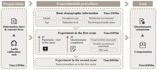 Prior to starting the experiment, the participants were briefly introduced to the research aims and process. They were asked to do an audio calibration task to make sure the experimental samples played the sounds correctly and to improve the consistency of the sound presentation among different people. Then, they were asked to fill in the socio-demographic information and pre-test psychological health status. The participants were then directed to click on a web link to access the first panoramic street walkway, where they were encouraged to visualize themselves within the depicted environment and to immerse themselves in the experience for a minimum of two minutes. Then, they were asked to complete the visual comfort assessment, the acoustic environment assessment, and the PRS. Following the same procedure, participants were asked to view the second scene and complete the questionnaires. Finally, they were allowed to leave the experiment.