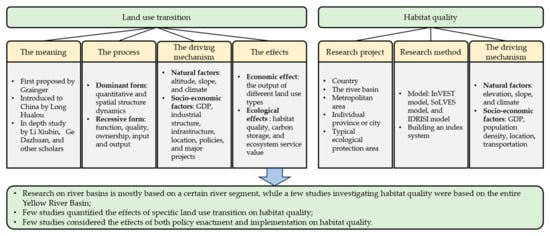 Academic research on land-use transition and habitat quality has made progress (Figure 1). With regard to land-use transition, the British scholar Grainger [15] proposed the concept of land-use transition based on the concept of forest transition by Walker [16] and Mather [17]. Grainger defined land-use transition as the evolution of land-use patterns in spatial and non-spatial structures within a specific region. This concept was introduced into China by Long Hualou at the beginning of the 21st century and defined as “regional land use patterns corresponding to the stage of regional socio-economic development” [18,19,20]. Since then, scholars have conducted extensive studies on the concept [21], process [22,23], driving mechanism [24], and economic and environmental effects [25,26,27] associated with land-use transition. For example, Ge et al. defined land-use transition as the process in which regional land is transitioned from one form (including explicit form and recessive form) to another in a specific process of social and economic change. They also pointed out that recessive form involves multiple attributes such as land quality, property rights, and management mode [21]. By using transition amplitude, transition duration, and the Lorentz curve, Qu et al. measured the law of construction land transition in the middle reaches of the Yangtze River Economic Belt from 1990 to 2015; the results showed that the main source of construction land had changed from farmland to forest [23]. Biggs et al. explored the impacts of land access, water availability, amenity migration, and government policies on land-use transition in the western US [24]. Yuan et al. conducted a study on the spatio-temporal evolution of carbon storage driven by land-use transition in the Yiluo River Basin in the middle section of the Yellow River; the results showed that the carbon sequestration capacity was on a downward trend from 1990 to 2020 [25].