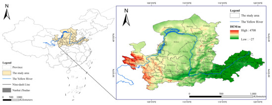 The Yellow River is called the Mother River of China, located at 32–42° N, 96–119° E (Figure 2). It originates from the BaYanKaLa Mountains on the Qinghai–Tibet Plateau in the west and crosses three steps of the terrain from west to east, including the Qinghai–Tibet Plateau, Inner Mongolia Plateau, Loess Plateau, Qilian Mountains, Helan Mountains, Taihang Mountains, and the North China Plain. The Yellow River flows through Qinghai, Sichuan, Gansu, Ningxia, Inner Mongolia, Shaanxi, Shanxi, Henan, and Shandong. It flows into the Bohai Sea in Kenli County of Shandong Province, with a total mainstream length of 5464 km. The geographic spatial span of the basin is large, and given the influences of monsoons and atmospheric circulation, the temperature and precipitation in different areas vary greatly. The average annual temperature at the northern foot of the BaYanKaLa Mountains is −4 °C, while that of the Yellow River Delta at its estuary is 14 °C. The annual precipitation in most areas is 200–600 mm, but the precipitation in Ningxia, Gansu, and other places is less than 150 mm. The upstream region is rich in hydropower resources, and the midstream and downstream regions are rich in mineral resources, which occupy an important position in the national resource reservation and development.