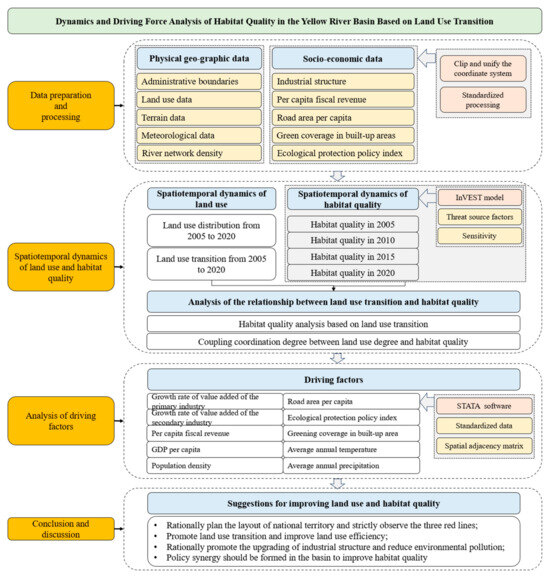 This paper takes 62 cities in the Yellow River Basin as its research object. The analysis considered land-use transition in the basin from 2005 to 2020, the spatio-temporal dynamics of habitat quality, and the relationship between the two, as measured with the habitat quality module of the InVEST model. An evaluation index system with three dimensions, including nature, social economy, and policy score, was constructed to explore the factors driving habitat quality change with respect to the spatial econometric model. The objectives of this study were to (1) map and identify the spatio-temporal characteristics of land-use transition and habitat quality change in the Yellow River Basin from 2005 to 2020; (2) investigate how land-use transition, natural factors, socio-economic factors, and government policies impact habitat quality; and (3) provide suggestions for promoting land-use transition and improving habitat quality.