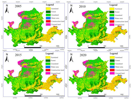 Figure 4. Distribution of land-use types in the Yellow River Basin from 2005 to 2020.