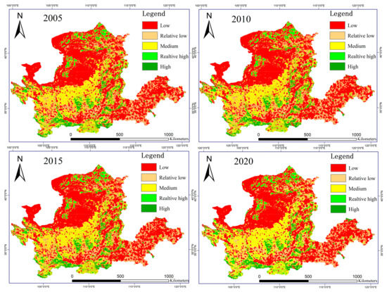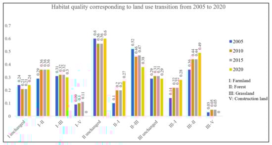 Based on the Equal Interval Classification of the ArcGIS10.8 software, the habitat quality of the study area from 2005 to 2020 was classified into five grades: low (0–0.2), relatively low (0.2–0.4), medium (0.4–0.6), relatively high (0.6–0.8), and high (0.8–1.0).