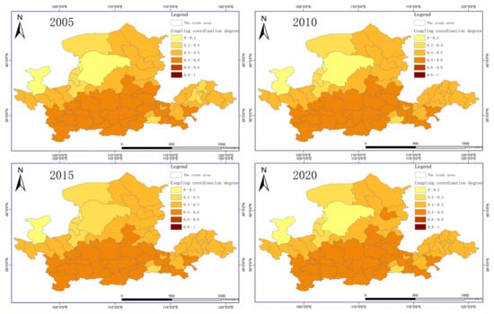 Coupling degree is an index used to analyze the degree of interaction between two or more elements, and coupling coordination degree is a model used to analyze the coordination between elements on the basis of a coupling degree calculation. Referring to relevant studies, the coupling coordination degree is divided into 6 levels [74,75] (Table 5). The formula is as follows: