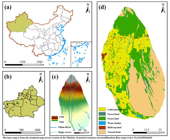 A geographical overview of the Tailan River Basin (TRB). (a) The geographical location of the TRB in China. (b) The geographical location of the TRB in provincial administrative divisions (Xinjiang Uygur autonomous region). (c) A digital elevation model (DEM) in the TRB. (d) A detailed figure of land use in the TRB.