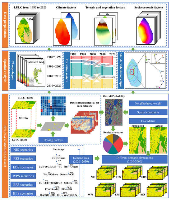 Land-Use and Land-Cover Change (LULC) models are increasingly being used to predict the conversion of land from one type of use to another. LULC models can be divided into empirical statistical (e.g., Logistic Regression—LR model; System Dynamics—SD model; and Markov Chain—MC model), spatial (e.g., CLUE-S), and coupled models (e.g., FLUS) models. Coupled models combine the advantages of top-down empirical statistical models and bottom-up spatial models by considering both LULC area and spatial distribution [23], and they are therefore more widely used in evaluating land-use conflicts [24], assessing ecosystem service impacts [25], quantifying soil erosion dynamics [26], and analyzing landslide susceptibility [27,28]. The Patch-generating Land Use Simulation (PLUS) model is a typical coupled model. By integrating a land expansion analysis module with cellular automata, it not only accurately analyzes the factors driving changes in various land classes, but also simulates the growth of the patches [29]. Research shows that PLUS outperforms other models for accurate simulation and more realistically captures the spatial characteristics of land-use change [30]. Scenario analysis assumes that a certain phenomenon or trend can continue into the future under a given set of conditions [31]. Scenario analysis has been used in natural sciences [32], social sciences [33], and a range of other disciplines. Land-use change does not evolve in a single direction and is influenced by natural changes, social developments, and local/national/regional planning. These and many more other factors make the changes in land use highly uncertain. The combined use of multiple scenarios and simulation models can provide a time-driven guide to complex future development strategies [34]. Thus, multi-scenario-coupled models not only show the evolution trend of land use, but also provide theoretical support for land management.