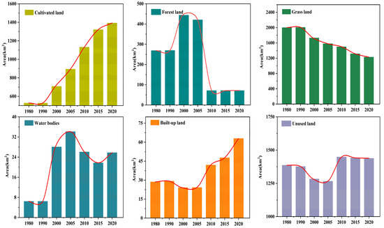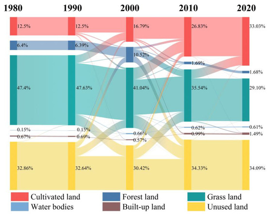 For the period of 1980–2020, differences were detected in spatial distribution and quantitative change in the six land-use types in the TRB. Among these, cultivated land occurred mostly in the central and western parts of the basin. Forest land occurred in the southeast, grassland in the north, and rivers flowed through the basin from the north to south. Built-up land occurred in the west, and unused land in the southeast of the basin (Figure 3). The amount of change in the six land-use types in the 1980–2020 period (Figure 4) indicates that the basin was dominantly covered by cultivated land, followed by grassland and unused land, together accounting for 92% of the study area. Of these, the area of cultivated land increased from 12.5% in 1980 to 33.03% in 2020, and that of forest land increased before 2000 and then rapidly decreased thereafter, dropping from 6.37% in 1980 to 1.68% in 2020. Grassland continuously decreased, falling from 47.44% to 29.10% in the 1980–2020 period. There was an initial rapid increase in water body (from 0.15 to 0.61%), followed by a more gradual decrease. Built-up land changed little before 2005 but rapidly increased thereafter (from 0.67 to 1.49%). Unused land had little overall change, increasing from 32.86% in 1980 to 34.09% 2020.