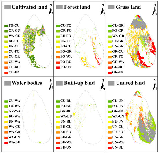 The spatial shifts in the six land-use types in the 1980–2020 period (Figure 5) showed that the greatest expansion in cultivated land occurred in the southwest of the TRB. Conversely, the most contractions of forest and grassland occurred in the south and southeast regions of the study area. There was increasing grassland in the central area of the basin, then changes in water bodies expanded minimally around the Tailan River, and built-up land significantly increased in the west of the basin. The area of unused land reduced due partly to conversion into other forms of land use in the western area, with a slight expansion in the southeast of the study area.