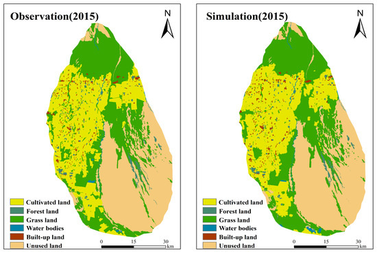 Comparison of observed (left) and PLUS-simulated (right) land use in Tailan River Basin (TRB) in 2015.