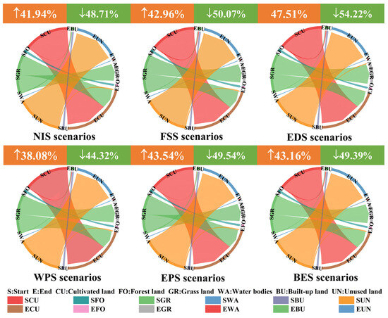 The main purpose of simulating future land sustainability for development is to support socio-economic development with a minimal effect on the ecosystem [53]. Analyzing historical changes in land use and exploring future land-use options are important ways of achieving this goal. The PLUS model was highly accurate at the validation stage, making it reliable for the subsequent multi-scenario runs. The simulation showed that for the 2020–2060 period, both arable and construction lands increased. Forest land slightly decreased, and the change in water bodies was insignificant, too. Additionally, grassland and unused land continuously decreased. The increase in arable land was fastest under the FSS, expanding to 661.5 km2 in 2060. The increase in the area and rate of construction land were fastest under the EDS, covering an area of 61.7 km2 in 2060. Compared with the NIS, the WPS had the smallest increase in arable land (598.07 km2), slowing the conversion rate of grassland to arable land. Compared with the NIS, the expansion rates of both built-up and arable lands slowed down under the EPS. This reduced the impact of human activity on the ecosystem, which further slowed the conversion rate of grassland. Compared with the EPS, the expansion rate of arable land and the contraction rate of grassland further slowed down under the BES. However, there was a rapid increase in built-up land. Compared with the EDS, EPS, and BES, the grassland area contracted by 606.08 km2, and built-up land expanded by 55.82 km2 under the BES.