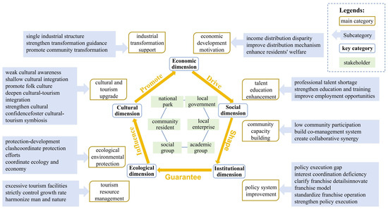- Revealing the limiting factors for sustainable development of the community: Through systematic analysis grounded in grounded theory, this study summarizes eight main categories that represent the community development challenges in Hainan Tropical Rainforest National Park (economic development motivation, industrial transformation support, talent education enhancement, community capacity building, ecological environmental protection, tourism resource management, policy system improvement, and cultural and tourism upgrade) and five core categories (economic, social, ecological, institutional, and cultural). The research shows that while ecological protection policies have significantly improved environmental quality, they have also triggered a series of issues in community economic and social development. These issues mainly manifest as income distribution disparity, single industrial structure, professional talent shortage, low community participation, excessive tourism facilities, protection–development clash, policy execution gap, interest coordination deficiency, weak cultural awareness, and shallow cultural integration, reflecting the complex and closely interconnected relationships between different categories. The interaction of these five dimensions further exacerbates the governance challenges, highlighting the importance and urgency of multi-party coordination mechanisms in achieving the dual goals of ecological protection and community development;