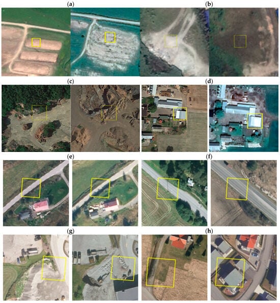 Pairwise examples of pixels (yellow box) from IMCC (20 × 20 m), against a background of remote sensing images from 2015 (left) and 2018 (right). Examples (a–d) are from Poland and (e–h) from Norway (Source of images for Poland: Google Earth Pro, for Norway: Norge Digitalt). (a) IMCC class 2 (loss of imperviousness), correct, impervious plastic-covered silage in 2015 removed in 2018. (b) IMCC class 2 (loss of imperviousness), should have been class 0 (no change, no imperviousness), but incorrectly classed as impervious in 2015. (c) IMCC class 11 (increased imperviousness), should have been class 0 (no change, no imperviousness). (d) IMCC class 11 (increased imperviousness), should have been class 10 (no change, with imperviousness). (e) IMCC class 0 (no change, no imperviousness), should have been class 10 (no change, with imperviousness) due to the existence of a road in 2015 and 2018. (f) IMCC class 1 (new imperviousness), should have been class 11 (increased imperviousness). (g) IMCC class 2 (loss of imperviousness), should have been class 10 (no change). (h) IMCC class 11 (increased imperviousness), correct.