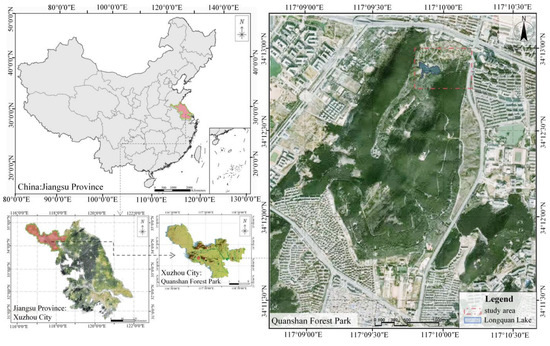 Xuzhou, an important city in Jiangsu Province, is situated in the southeastern part of the North China Plain and the northwestern region of Jiangsu Province. The city serves as a key gateway in eastern China and lies along an essential migratory route for birds. It exhibits a typical temperate monsoon climate characterized by distinct seasonal variations. Historically reliant on coal mining, Xuzhou is now transitioning toward ecological restoration and sustainable urban development due to the gradual depletion of its coal resources. Ecologically, the surrounding landscape is diverse, including plains, mountains, and rivers, which provides significant ecological complexity and biodiversity. Such diverse ecosystems position Xuzhou Quanshan Forest Park as a representative study area within regional ecological research contexts (Figure 1), established on 1 January 1984. In recent years, it has been designated as a provincial environmental protection and science education base, as well as a provincial youth education base [17]. The total area of the reserve spans 370 ha, consisting of low mountain and hilly terrain formed by five peaks: Yunlong shan, Jinshan, Taishan, East Quanshan (the highest at an elevation of 235 m), and West Quanshan. East and West Quanshan are connected in the southern part (34°13′10″–34°11′30″ N, 117°08′21″–117°09′60″ E), forming a “U” shape when viewed from above. A natural channel known as the Longquan Stream lies between these two peaks. Because the other three peaks are over 1 km away and located in the suburban area, the core zone of the reserve—Quanshan Forest Park—has been established mainly as the area between East and West Quanshan. The core area covers 1.85 ha [18,19].