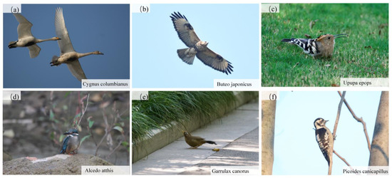 Rare, protected, and endemic Species. (a) Cygnus columbianus (Tundra Swan) reflects the excellent and diverse ecological quality of the park, as it appears during migration. (b) Buteo japonicus (Eastern Buzzard), a nationally protected species, underscores the integrity of the forest ecosystem. (c) Upupa epops (Common Hoopoe), a characteristic bird of the park, enriches the biodiversity of the forest–grassland ecotone. (d) Alcedo atthis (Common Kingfisher), an indicator species of aquatic ecosystems, signifies a healthy water environment in the park. (e) Garrulax canorus (Hwamei), a protected species, indicates high vegetation health within the mountainous forest areas. (f) Picoides canicapillus (Grey-capped Pygmy Woodpecker), a beneficial forest bird, contributes to maintaining ecological balance in the park’s forest ecosystems.