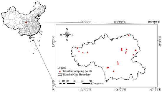 Fieldwork was conducted in plantation forests managed under carbon sequestration projects in Tianshui City, Gansu Province, China. Tianshui is located in the western Qinba Mountains between 34°36′ and 35°42′ N and 105°32′–106°56′ E, with a total area of approximately 14,000 square kilometers [27,28]. Tianshui is situated in a typical arid inland climate zone [27]. Its regions can be divided into temperate continental arid and temperate semi-humid regions [27,28]. The most-planted species belong to the Prunus and Pinus genera. Plantation forests belong to Southeast Tibet shrublands and meadows and Central China Loess Plateau mixed forests in Qinba Mountains [29].