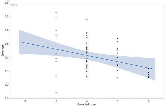 Table 2 shows that linear regression models of the relationships between community diversity and FIA scores in the western Qinba Mountains, China. We found that FIA scores were negatively correlated with Pielou’s evenness index (R2 = 0.104; mean square error = 0.014; standard error = 0.104; p = 0.012; Table 2 and Figure 2). The residual values of the relationship between FIA scores and Pielou’s evenness index ranged from −0319 to 0.268 (Figure 3). However, there were no significant relationships between FIA scores and the Shannon–Wiener index, species richness, and inverse Simpson’s index (p > 0.05; Table 2). The scores related to animals, climber species, and stands were significantly associated with community diversity (p < 0.05; Table 2).