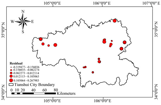 Map showing the residual values of the relationship between FIA scores and Pielou’s evenness index.
