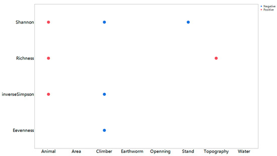 Figure 4, coupled with Table 3, shows that differences in community diversity, including species richness, Shannon–Wiener index, inverse Simpson’s index, and Pielou’s evenness index in the western Qinba Mountains, China. Based on the ANOVA results, the presence of animals and a complex topography favored high levels of community diversity (Figure 4; Table 3). Specifically, the presence of animals had positive effects on the Shannon–Wiener index, species richness, and inverse Simpson’s index, and the presence of climber species was negatively correlated with the Shannon–Wiener index, inverse Simpson’s index, and Pielou’s evenness index (p < 0.05; Figure 4; Table 3). A complex topography had positive effects on species richness, while a rich standing condition had negative effects on the Shannon–Wiener index (p < 0.05; Figure 4; Table 3).