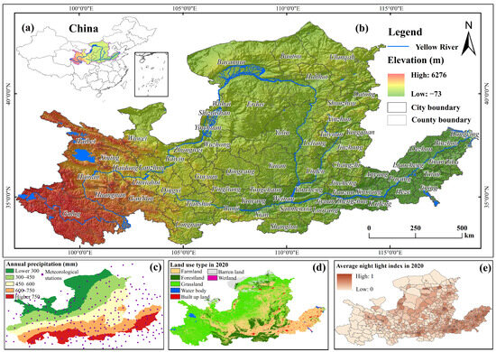 (a) Geographical location of the study area. (b) Elevation. (c) The annual average precipitation in 2020. (d) Land use types in 2020. (e) Average night light index of 538 counties in 2020. Note: China’s administrative division system consists of four hierarchical tiers: (1) provincial-level divisions, (2) prefecture-level divisions, (3) county-level divisions, and (4) township-level divisions. At the county level, these encompass municipal districts (subdivisions of prefecture-level cities; typically urban core zones with high population density and intensified land use), county-level cities, counties, and autonomous counties.