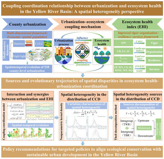 Against this backdrop, this study aims to address the critical need for understanding the coupling coordination between ecosystem health and urbanization in the Yellow River Basin (YRB), a region of strategic importance for China’s ecological security and high-quality development. By focusing on the county scale, this research provides a granular perspective on the spatial heterogeneity and driving mechanisms of ecosystem health–urbanization interactions. This study’s innovation lies in its integration of multi-source data and advanced spatial analysis techniques to (1) evaluate the spatiotemporal evolution characteristics of ecosystem health and urbanization at the county level; (2) quantify the coupling coordination degree (CCD) between these two systems; and (3) identify the sources and evolutionary trajectories of spatial disparities in ecosystem health–urbanization coordination across the YRB. These contributions not only advance the theoretical understanding of ecosystem health–urbanization interactions but also identify leverage points for policy intervention, offering actionable insights for achieving sustainable urbanization in ecologically fragile regions.