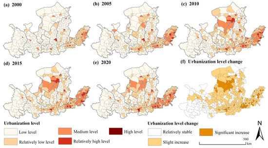 Figure 3 depicts the spatiotemporal evolution of the urbanization level at the prefectural scale within the YRB from 2000 to 2020. To facilitate a comparative analysis of the urbanization levels across different stages and ensure methodological objectivity, the evaluation results were classified into five distinct levels using the natural breaks (Jenks) method in ArcGIS: low level (less than 0.104), relatively low level (0.104–0.215), medium level (0.215–0.488), relatively high level (0.488–0.697) and high level (greater than 0.697).