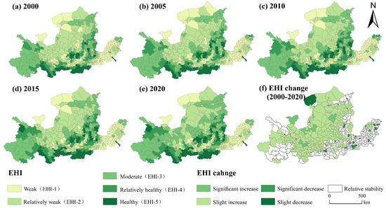 Spatial–temporal change in ecosystem health of 538 counties in the YRB from 2000 to 2020.