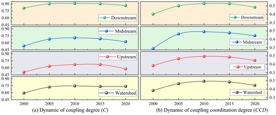 Dynamics of coupling degree (C) and coupling coordination degree (CCD) in the YRB from 2000 to 2020.