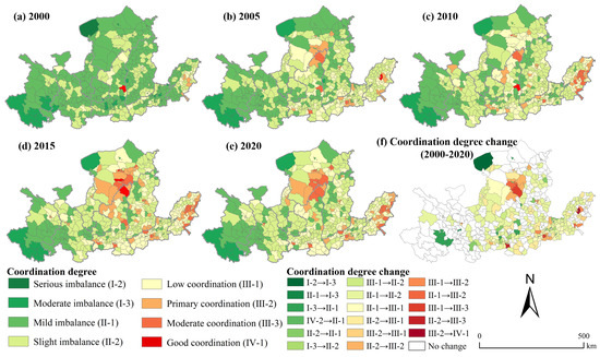 Spatial–temporal change in coupling coordination degree of 538 counties in the YRB from 2000 to 2020.
