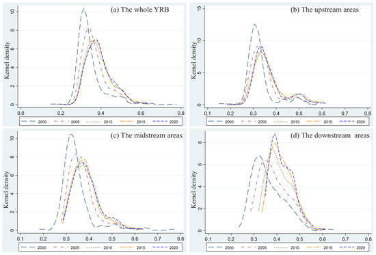 Figure 7 displays the continuous density curves for the entire YRB, as well as its upstream, midstream and downstream sub-regions, generated using R4.1.2 software. As illustrated in Figure 7a, the density functions for the five representative years exhibit a distinct “single peak” pattern, reflecting significant spatial heterogeneity in CCD distribution across the YRB. Notably, the widening of the distribution intervals and the rightward shift of the main peak—with the corresponding CCD value increasing from 0.3 in 2000 to 0.38 in 2020—suggest a progressive convergence of coordination levels.