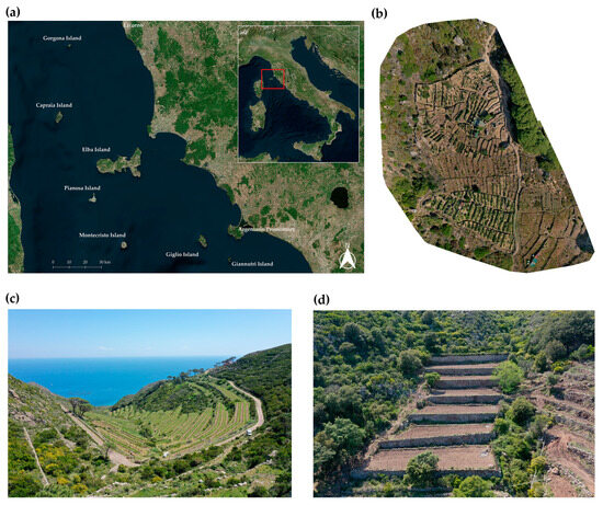 The Tuscan Archipelago is located close to the Tuscan coast, between Livorno and the Argentario Promontory (Figure 1a). The major islands of the Archipelago are seven in total, from north to south, in order: Gorgona, Capraia, Elba, Pianosa, Montecristo, Giglio, and Giannutri. To these are added some smaller islets for a total surface area of approximately 300 km2 [66]. All the islands, except Pianosa and Giannutri, have a very lively and usually steep relief. However, they reach modest heights, apart from the exceptional culmination of Monte Capanne in western Elba, which rises to 1018 m. Given the Archipelago’s natural vocation for tourism, the territory’s government’s mission is to conserve the environment; in this regard, on 22 July 1996, the Tuscan Archipelago National Park was established [67]. The park falls within the provinces of Livorno and Grosseto and is the largest marine park in the Mediterranean, with one-fifth of Italy’s protected marine area. It involves the protection of 56,766 ha of sea and 17,887 ha of land. The predominant vegetation in the park consists of the typical Mediterranean scrub species. The most widely distributed vegetation types in the non-cultivated areas are characterised by medium-high scrub consisting of shrubs such as strawberry tree (Arbutus unedo), Phoenician juniper (Juniperus phoenicea), heather (Erica sp.), lentisk (Pistacia lentiscus), and myrtle (Myrtus communis) [68]. The climate is characterised by alternating hot and mostly dry summers, with sometimes considerable humidity due to the close presence of the sea, and fairly mild and windy winters. Rainfall, as typically occurs in Mediterranean climates, is mainly distributed in the intermediate and winter seasons, while it is almost absent in the summer [69]. The study area is represented by four islands of the Tuscan Archipelago, in order of surface area: Elba Island (223.52 km2), Giglio Island (21.21 km2), Capraia Island (about 20 km2), and Gorgona Island (2.23 km2). Pianosa, Montecristo, and Giannutri were excluded from the survey because they do not have agricultural terraced areas.