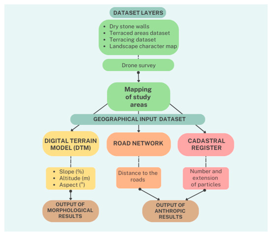 Given the complexity of the research, which aims to estimate the consistency of terraced landscapes within the Tuscan Archipelago, an approach combining digital cartographic resources, where present and exhaustive, and in situ aerophotogrammetric surveying with drones was adopted. Surveys conducted directly on-site played a key role in identifying areas that could not be easily identified using digital cartography only. When the data were acquired, they were entered into a dedicated GIS (Geographical Information System) to manage and process the geospatial data and provide a complete information framework for the quantitative analysis of the terraced areas.