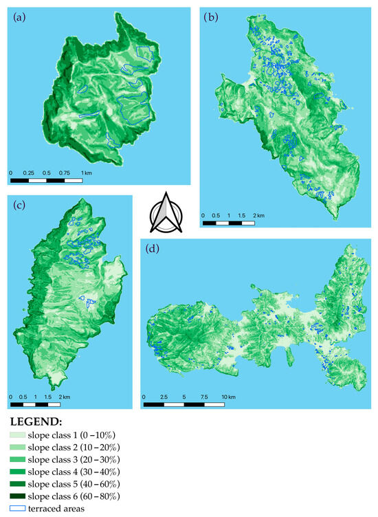 Slope classification of terraced areas on the four islands: (a) Gorgona Island; (b) Giglio Island; (c) Capraia Island; (d) Elba Island.