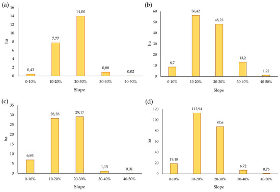 The clipping of the slope raster on the terraced areas allowed the creation of reports of the distribution values of the terraced areas’ surface in different slope classes (Figure 4): the most representative slope classes for the four islands are the second and third (86.66% of terraced areas), with 205.41 ha for slopes between 10 and 20%, and 179 ha for slopes between 20 and 30%, respectively. The terraced areas with slopes lower than 10% were modest (<20 ha for Elba Island and lower than 16 ha for the other three islands). Equally small were the surfaces with slopes between 30 and 40% and between 40 and 60%; these can be attributed to the greater difficulty of building dry stone walls at steep slopes, as well as the cultivation and maintenance operations on the structures themselves. It should be noted that the sixth class (60–80% slope) is entirely absent from the study areas.
