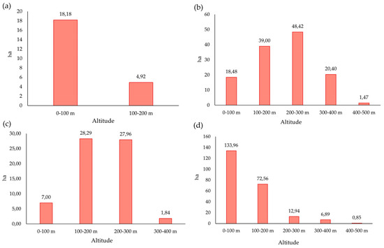 Distribution of terraced areas according to altitude classes: (a) Gorgona Island; (b) Giglio Island; (c) Capraia Island; (d) Elba Island.