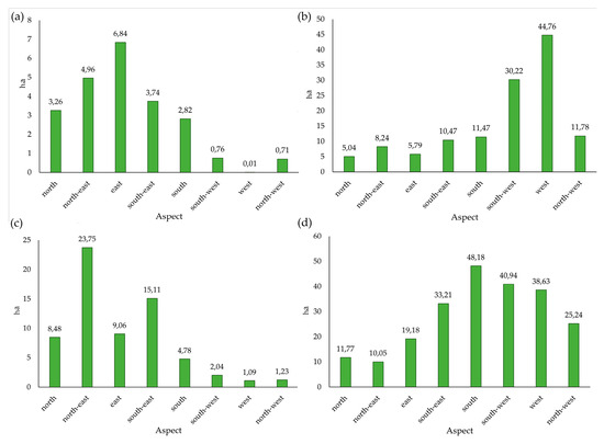 The last analysis of geomorphological parameters concerned the spatial distribution of terraced areas in relation to the aspect parameter (Figure 6). Unlike the analysed variables until now, this parameter presents the greatest inhomogeneity between the four islands: the results obtained (Figure 7) show similar distributions between Gorgona Island and Capraia Island, with a prevalence of terraced areas with north-east/east/south-east aspect, occupying in the first case 67.56%, while in the second case 73.12% (with a surface area of 15.54 ha and 47.92 ha, respectively). Although not particularly effective in exploiting solar radiation, these locations are confined to the extent of the two islands’ road network.