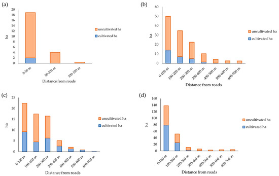 Distribution of cultivated or uncultivated terraced areas according to distance from roads classes: (a) Gorgona Island; (b) Giglio Island; (c) Capraia Island; (d) Elba Island.
