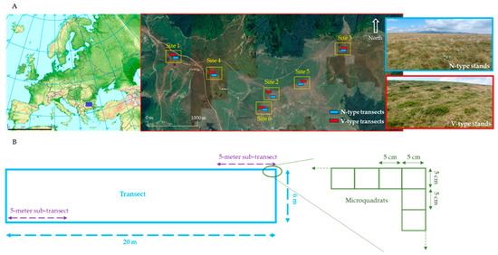 (A) A map of the study area in the Central Balkan Mountains, Bulgaria, illustrating its location within Europe and the paired transect design. The insets show photographic examples of vegetation types N and V. The European map is adapted from the European Environmental Agency’s map of Major mountain ranges of Europe (1500 km scale). The study site map was generated using Google Earth (1000 m scale). (B) A schematic diagram of a transect, composed of 1040 contiguous 5 × 5 cm micro-quadrats.