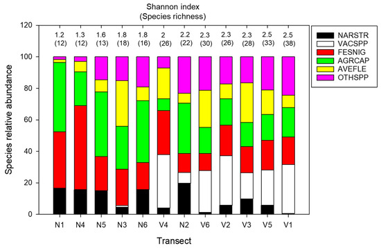 The relative abundances of species and alpha diversity in each transect: N1–N6 and V1–V6 are the transects positioned in grass-type and mixed-type vegetation, respectively. Species with more than 10% abundance are plotted independently (NARSTR—N. stricta; VECSPP—Vaccinium spp; FESNIG—F. nigrescens; AGRCAP—A. capillaris; AVEFLE—A. flexuosa). The abundances of species below the 10% threshold are presented together as other species (OTHSPP). The transects are sorted in ascending order of increase in the Shannon index.