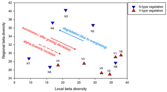 A conceptual graph illustrating the link between scale-dependent beta diversity and vegetation dynamic, which is developed in the Discussion section. Regional beta diversity is calculated for each stand (N1–N6; V1–V6) as the average of all pairwise dissimilarities (%) between the respective transect and all other transects of the vegetation type. Local beta diversity is calculated for each stand as the average of all pairwise dissimilarities (%) between the sub-transects within the respective transect.