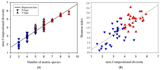 (a) The relationship between the number of abundant species and the spatial complexity of the vegetation matrix (max. compositional diversity). (b) The dependence of alpha diversity (Shannon index) on the spatial complexity of the vegetation matrix (max. compositional diversity).