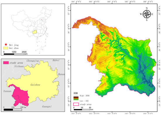 The Nanpan and Beipan River Basins, located at 104°00′–106°00′ E and 24°40′–26°48′ N, cover an area of about 29,000 square kilometers and feature a notable elevation range from 255 to 2856 m (Figure 1), where the maximum thickness of carbonate rock layer is up to 85% of the total overburden layer, and the area with slopes over 25 degrees is about 45% of the total area [32]. They have a very fragile ecological environment, but the study area boasts rich biodiversity and a variety of vegetation types. However, even with high forest coverage, the region still faces severe ecological degradation and rocky desertification. The unique karst topography of the Nanpan and Beipan River Basins has given rise to a rich and diverse range of ecosystems, with forest ecosystems, grassland ecosystems, and agricultural ecosystems being the most widely distributed. The karstification process, which shapes the unique karst landscapes, introduces ecological microenvironments such as underground rivers and caves within forest ecosystems, thereby enhancing their biodiversity. Moreover, these karst features play a significant role in the carbon budget. The dissolution of carbonate rocks in karst areas not only contributes to the formation of these distinctive habitats but also affects carbon sequestration and release processes. The carbon stored within the karstic substrates and the associated ecosystems can impact the overall carbon cycle, thereby increasing the relevance of the value of ecosystem services provided by these landscapes.