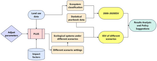 This study employed remote sensing imagery and Geographic Information System (GIS) data to conduct an annual spatial analysis of ecosystem distribution within the defined study area. This approach facilitated the creation of precise annual maps of ecosystem spatial distribution, ensuring data integrity and timeliness. By utilizing statistical yearbook data, the annual value of ecosystem services was calculated, establishing a solid foundation for valuation computations. A spatiotemporal analysis of ecosystem service values over multiple years was conducted to identify trends, providing a reference for subsequent scenario modeling and policy development (Figure 2).
