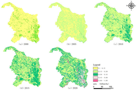 Analyzing the data presented in Table 2 and Figure 3, it is evident that the alterations in ecosystem area within the Nanpan and Beipan River Basins between 2000 and 2020 are indicative of the efficacy of ecological conservation and management strategies. Despite experiencing minor fluctuations, the forest ecosystem maintained a general state of stability, with a slight reduction from 1343.79 103 hectares to 1241.96 103 hectares, attributable to the implementation of policies promoting the conversion of agricultural land to forested areas. A notable expansion was observed in the grassland ecosystem, which increased from 782.09 103 hectares to 867.82 103 hectares, thereby augmenting vegetation coverage and improving soil attributes. The wetland ecosystem experienced a marked expansion, growing from 5.09 103 hectares to 22.16 103 hectares, signifying the successful outcomes of conservation initiatives. Conversely, the area designated for farmland decreased, shrinking from 741.03 103 hectares to 711.37 103 hectares, as a result of the ecological transformation of marginal land. Urban areas witnessed a modest expansion, while the desert ecosystem remained largely unchanged. Collectively, these transformations have facilitated the enhancement of the basins’ ecological environment and the upliftment of ecosystem service value.